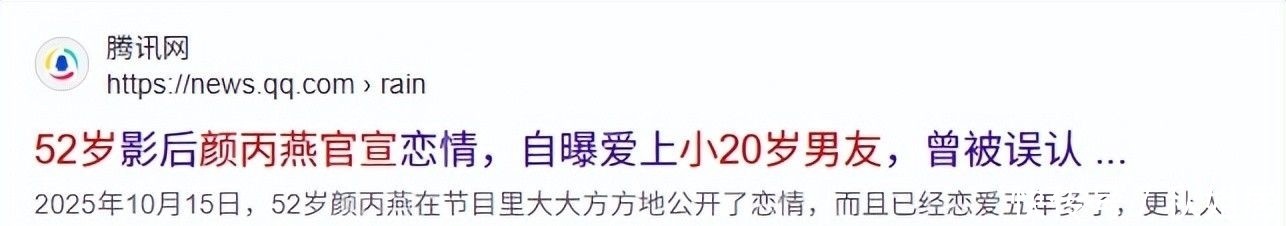2.腾讯网:52岁影后颜丙燕官宣恋情,自曝爱上岁男友,曾被误认成是母子